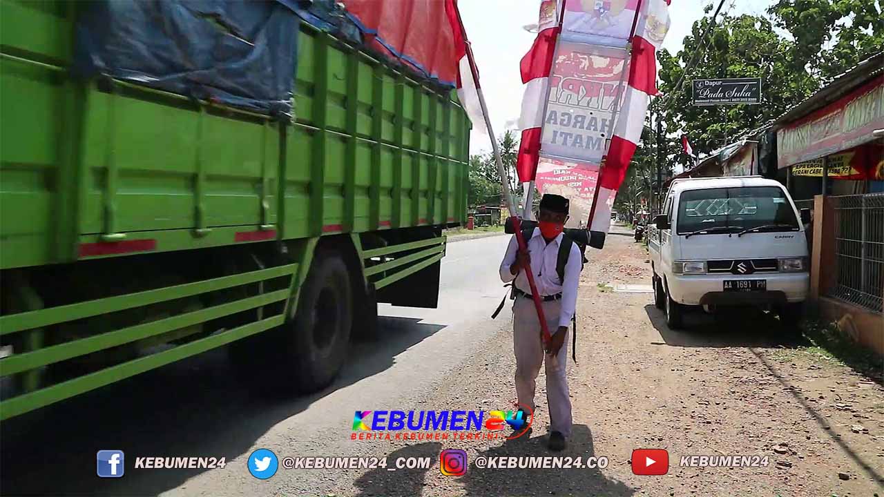 Seperti saat sedang melintas di Jalan Raya Kebumen tepatnya di depan Kantor Kecamatan Sruweng Kabupaten Kebumen Selasa 18 Agustus 2020. Penampilan Watimin yang mengenakan Kemeja Putih, Celana Putih dan Peci Hitam tanpak tetap semangat melakukan perjalanannya. Tak hanya itu, ia juga membawa sejumlah atribut lain seperti bendera Merah Putih.