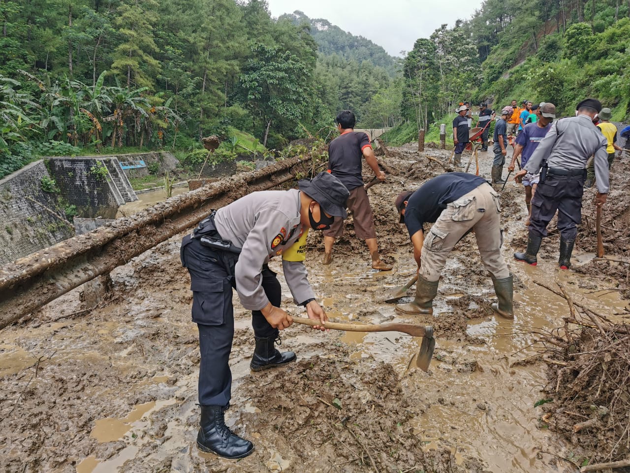 “Personel kita, baik dari Polres (Sat Samapta) bersama dengan Polsek, serta warga masyarakat setempat dan BPBD sejak pagi bekerja bakti membersihkan lumpur. Akibat kejadian itu, jalan lumpuh total dan harus mengambil route lain,” jelas Iptu Sugiyanto.