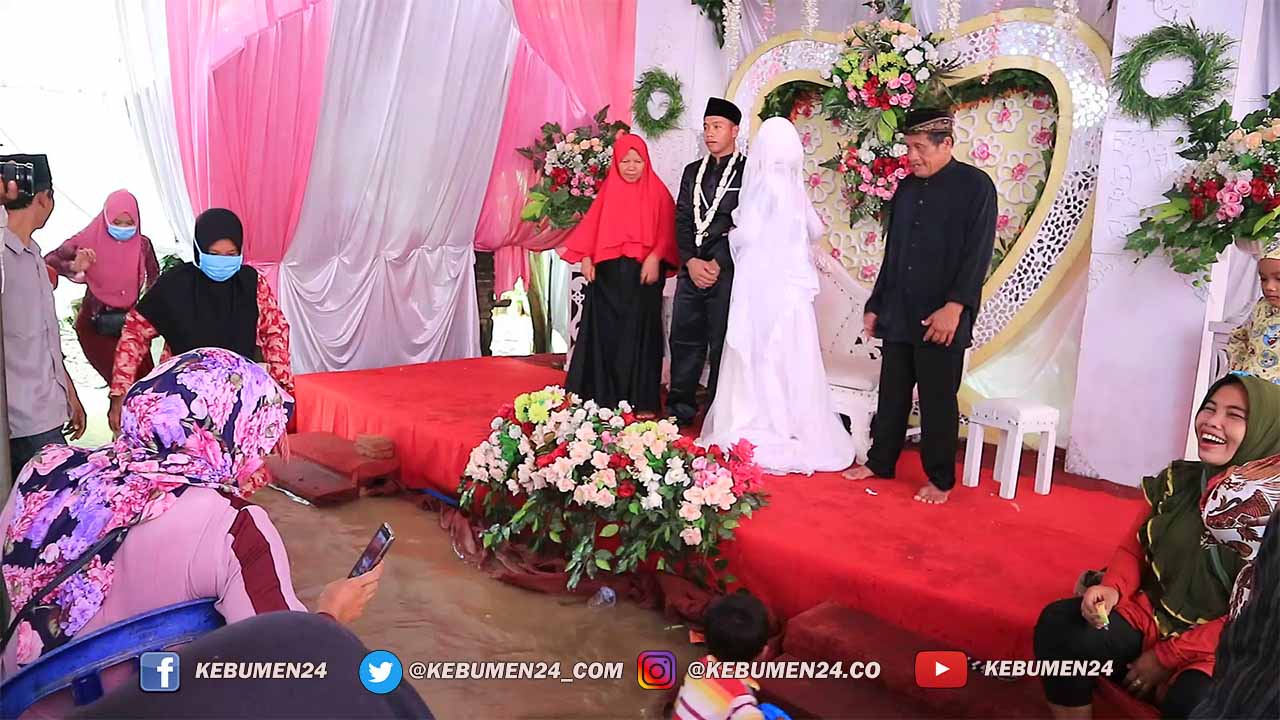 Kuwarasan, Kebumen24.com –Akibat Hujan deras yang melanda wilayah Kebumen sejak Senin 16 November 2020 kemarin menyebabkan terjadinya banjir di beberapa titik lokasi. Bahkan sepasang pengantin di Dukuh Pacor 2 RT 01 RW 05, Desa Banjareja Kecamatan Kuwarasan terpaksa melangsungkan pesta pernikahannya ditengah musibah banjir.