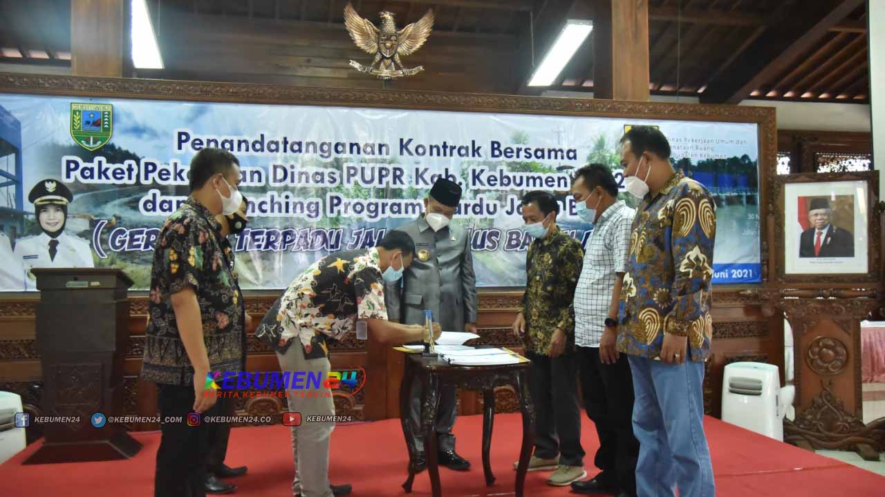 KEBUMEN, Kebumen24.com – Pemerintah Kabupaten Kebumen melakukan penandatanganan kontrak bersama paket pekerjaan Dinas PUPR para penyedia jasa terkait pembenahan dan pembangunan infrastruktur. Penandatanganan dilakukan di Pendopo Rumah Dinas Bupati, Kamis 10 Juni 2021.