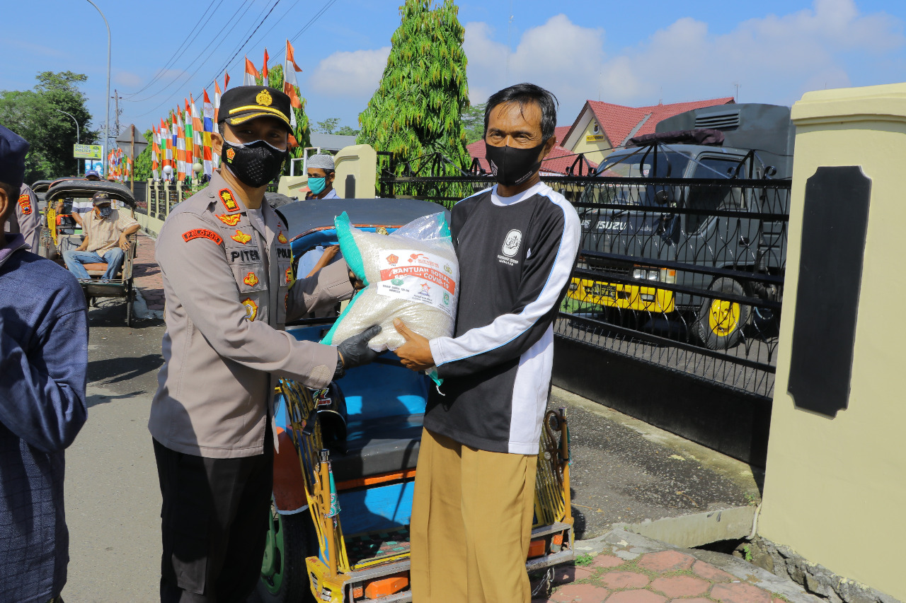 KEBUMEN, Kebumen24.com – Ditengah diberlakukannya Kebijakan PPKM Darurat, Polres Kebumen membagikan beras kepada komunitas abang becak Kebumen. Sedikitnya 60 paket sembako dibagikan oleh kapolres Kebumen AKBP Piter Yanottama Minggu 11 Juli 2021.