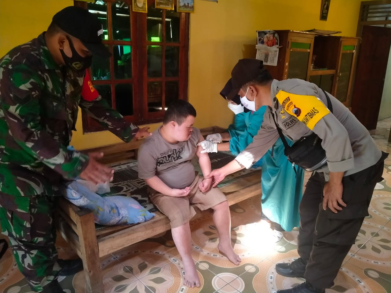 “Kita dampingi petugas Puskemas melakukan vaksinasi di tiga warga penyandang disabilitas. Pendampingan ini sekaligus untuk mensukseskan program vaksinasi yang juga program pemerintah pusat,” jelas Iptu Tugiman. Rabu 18 Agustus 2021.