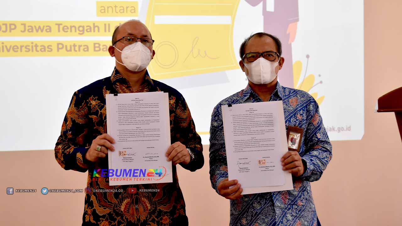 PEJAGOAN, Kebumen24.com – Universitas Putra Bangsa Kebumen dan Kanwil Direktorat Jendral Pajak Jawa Tengah II melakukan Penandatanganan Kesepakatan Bersama Memorandum of Understanding (MoU). Penandatanganan dilakukan oleh Kepala Kanwil DJP Jawa Tengah II Slamet Sutantyo dan Rektor Universitas Putra Bangsa Dr. Gunarso Wiwoho, S.E.,M.M. di Gedung Aula Kampus Jalan Ronggowarsito Pejagoan Kebumen, Kamis 26 Agustus 2021.