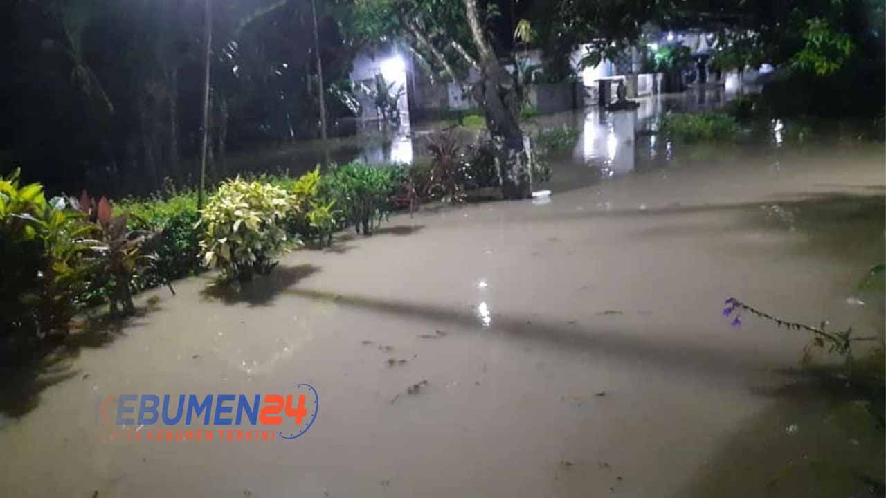 ALIAN,Kebumen24.com – Hujan deras sejak sore menyebabkan intensitas aliran air meningkat. Tidak terkecuali Sungai Kedungbener yang mengakibatkan tanggul sungai jebol, Sabtu 11 Desember 2021. Kondisi tersebut memicu terjadi banjir pada pemukiman warga.