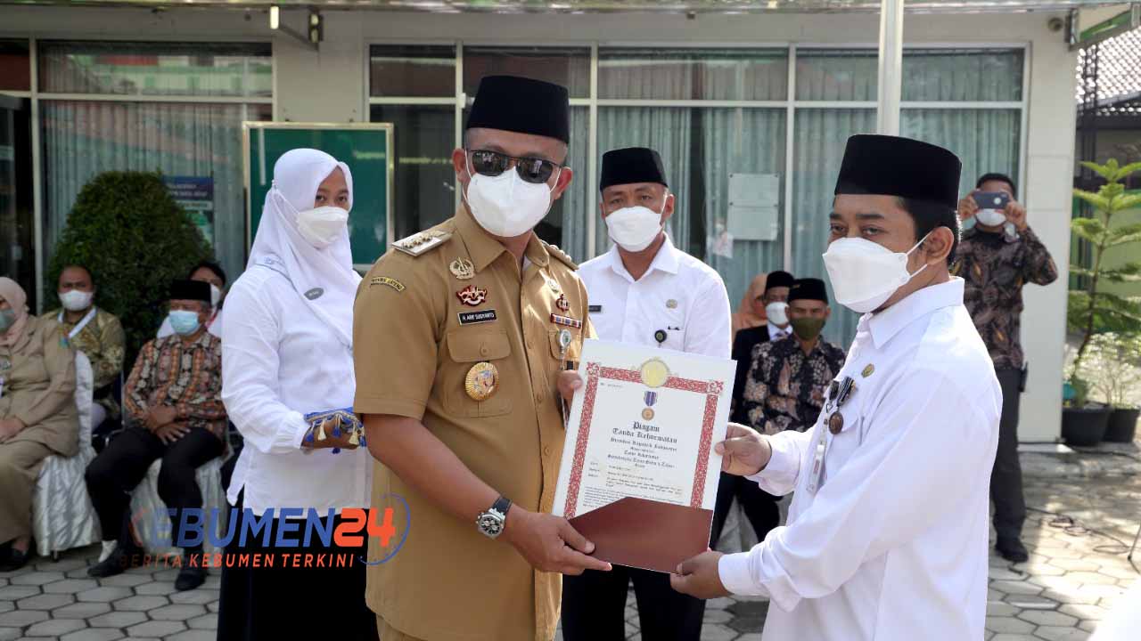 Penghargaan tersebut diserahkan secara simbolis oleh Bupati Kebumen Arif Sugiyanto, pada acara peringatan Hari Amal Bhakti ke-76, di Halaman kantor Kemenag Kebumen, Senin 3 Januari 2021. Kedua pegawai tersebut adalah Azam Zukri S.Sos yang telah mengabdi tanpa cacat selama 10 tahun dan Riyati telah berkerja selama 20 tahun.