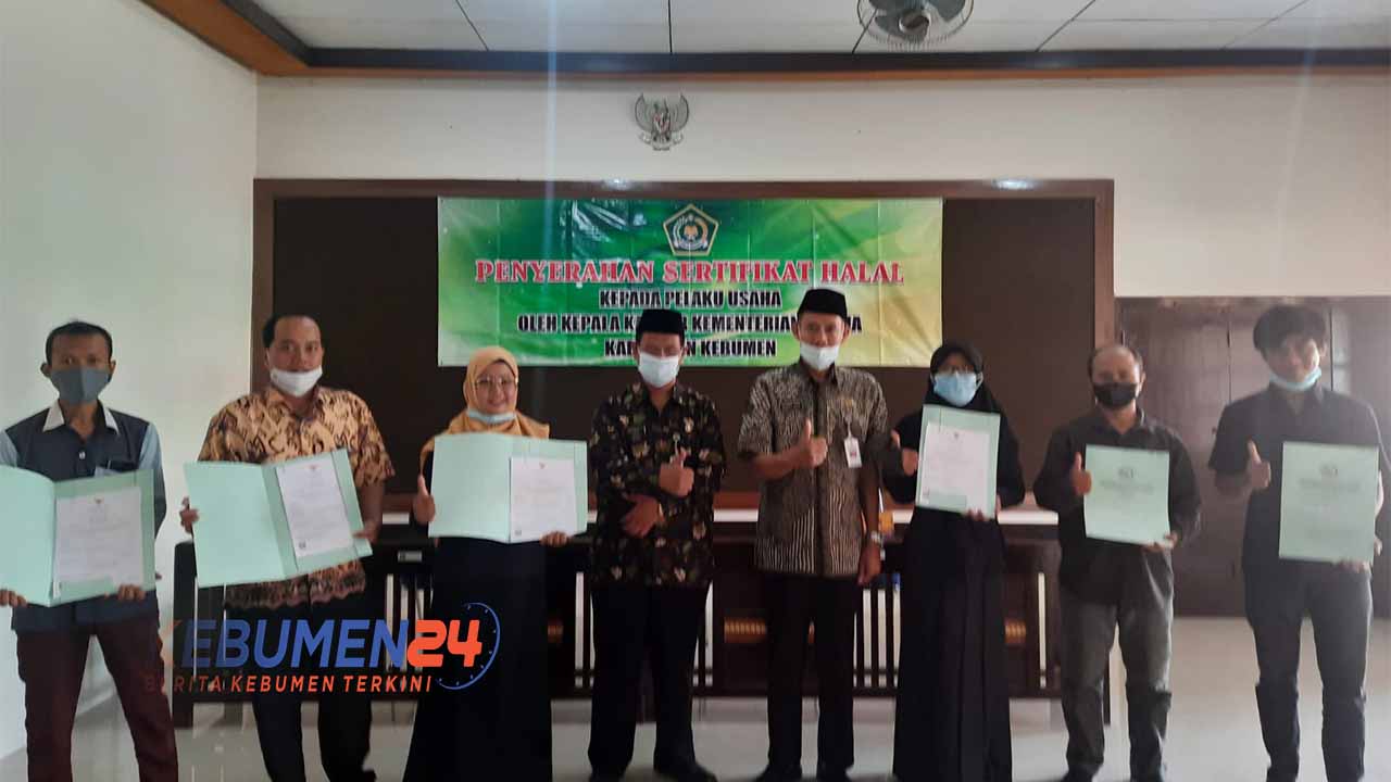 KEBUMEN, Kebumen24.com – Kantor Kementrian Agama Kebumen menyerahkan sertifikat halal kepada Tujuh pelaku usaha Mikro dan Kecil (UMK) di Kabupaten Kebumen. Penyerahan dilakukan di Kantor Kemenag Kebumen Rabu 19 Januari 2022.