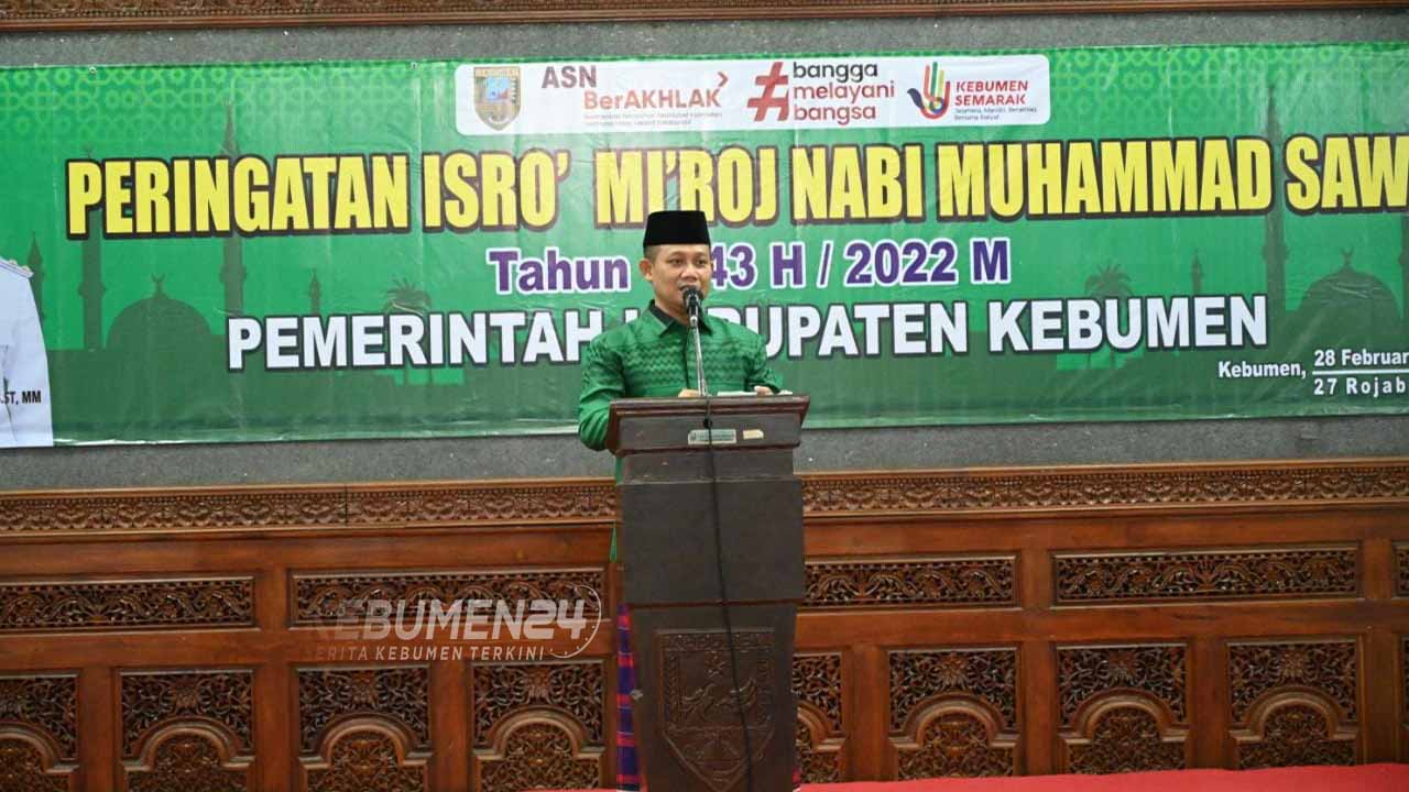 Hal itu disampaikan Bupati Kebumen Arif Sugiyanto pada acara peringatan Isra Miraj di Pendopo Kabumian, Senin 28 Februari 2018. Hadir Bupati Kebumen Arif Sugiyanto SH, Wakil Bupati Hj. Ristawati Purwaningsih, S.ST,MM, Sekda Kebumen H. Ahmad Ujang Sugiono, SH, Jajaran Forkopimda Tokoh Ulama, serta para OPD dilingkungan Pemkab Kebumen.