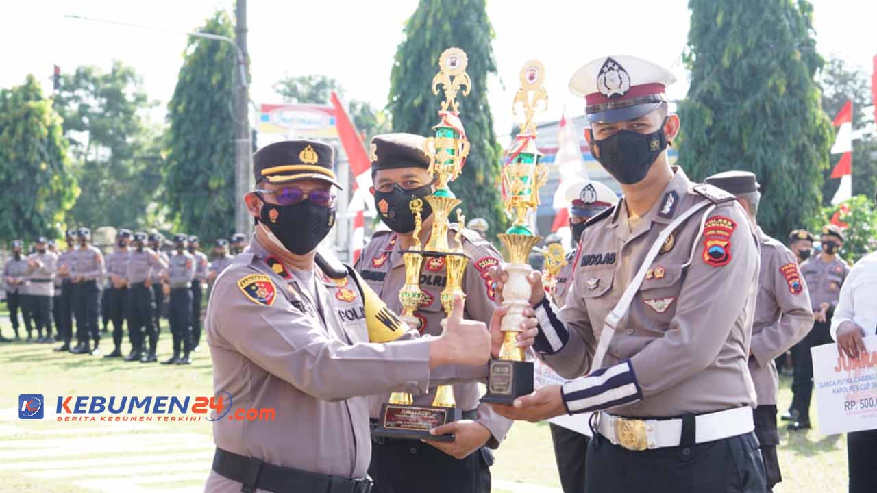 KEBUMEN, Kebumen24.com – Kapolres Kebumen AKBP Burhanuddin menyerahkan piala bergilir kepada para pemenang lomba olahraga di tingkat internal itu, Senin 18 Juli 2022. Para pemenang ini merupakan peserta dari berbagai pertandingan olahraga dalam rangka peringatan Hari Bhayangkara ke-76 Polres Kebumen.