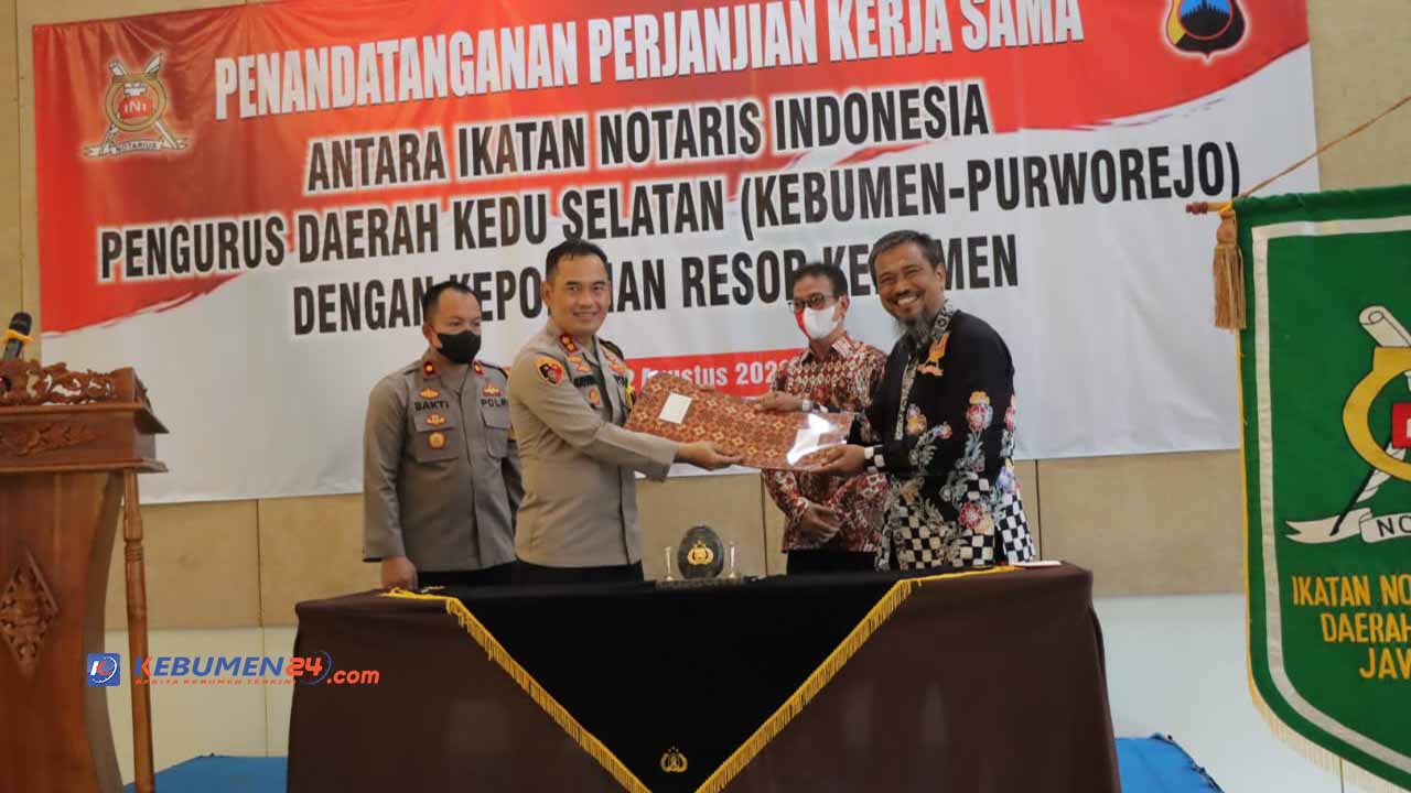 Kerja sama ini ditandai dengan penandatanganan nota kesepahaman antara Polres Kebumen dan notaris di gedung pertemuan Sekar Jagad, Hotel Mexolie Kebumen, Jumat 12 Agustus 2022.