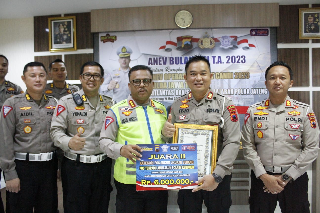 KEBUMEN, Kebumen24.com – Pos Terpadu Alun-alun Kebumen Operasi Ketupat Candi 2023 memperoleh Reward juara 2 dari Kapolda Jateng Irjen Pol Ahmad Lutfi. Reward diberikan melalui Dirlantas Polda Jateng Kombes Pol Agus Suryo Nugroho saat pelaksanaan analisa dan evaluasi (Anev) Operasi Kemanusiaan Ketupat Candi 2023 dalam rangka pengamanan rangkaian libur lebaran 1444 Hijriyah, di Mapolda Jateng, Selasa 9 Mei 2023.