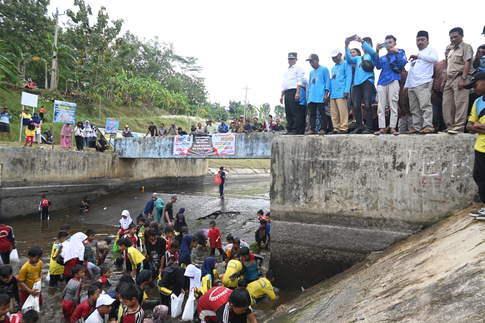 Di sana, juga tidak kalah ramai, ribuan orang dari anak-anak, remaja, dewasa sampai orang tua turun ke sungai untuk menangkap ikan dari saluran irigasi waduk. Dengan memanfaatkan alat tangkap ikan sederhana mereka berlomba-lomba menangkap ikan.