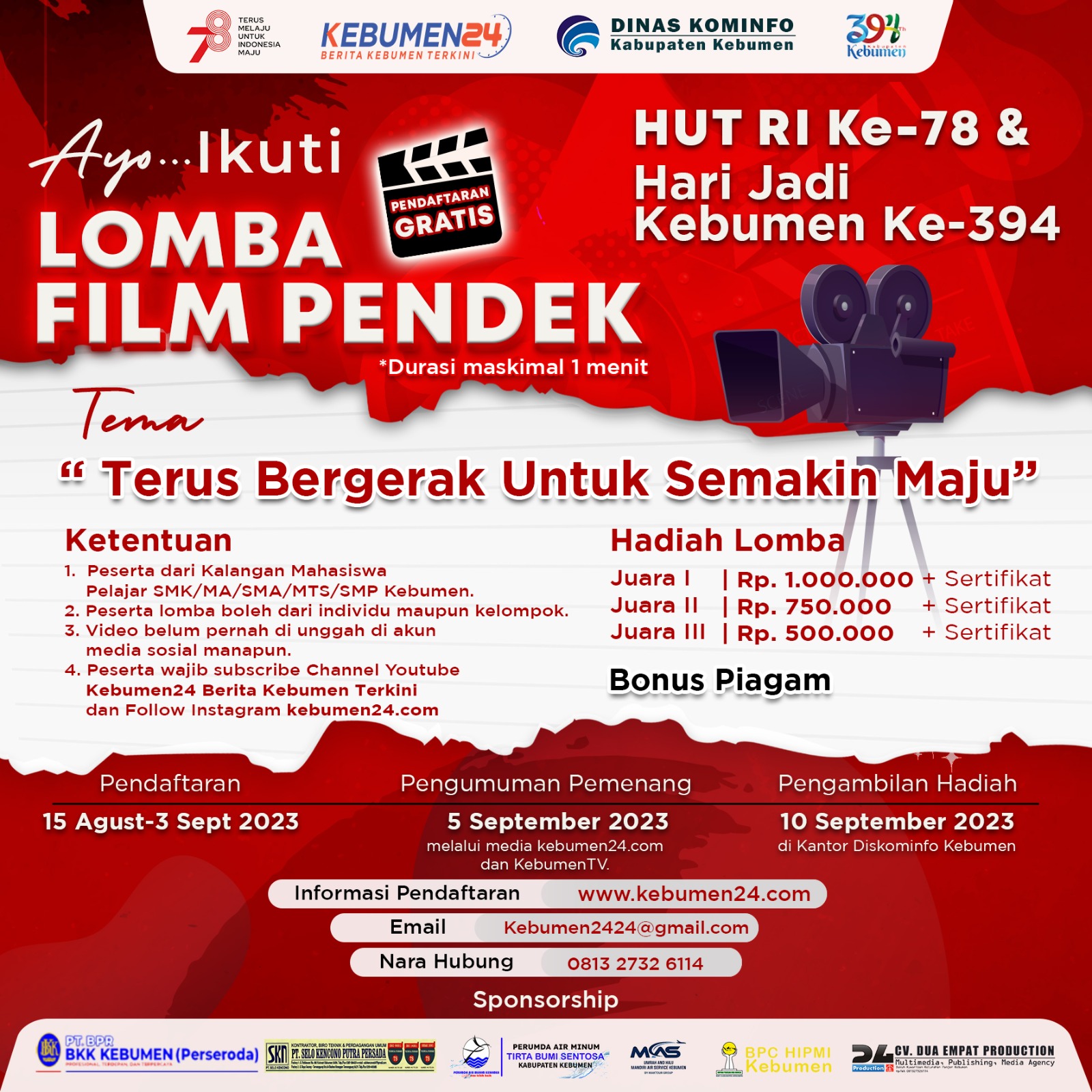 KEBUMEN, Kebumen24.com – Dalam rangka mengisi hari ulang tahun kemerdekaan RI ke 78, dan Hari Jadi Kebumen ke 394, Media Online Kebumen24, kembali mengadakan Lomba Film Pendek, dengan hadiah jutaan rupiah. Lomba kali dengan mengangkat Tema ‘’Terus Begerak untuk Semakin Maju’’ ini digelar atas kerjasama dengan Dinas Kominfo Kebumen.