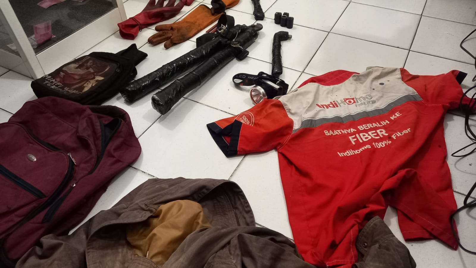 Barang bukti sarung tangan karet, gunting khusus kabel, obeng, cutter, sepatu warna merah, senter, jaket warna coklat dan seragam berlogo Indihome diamankan polisi.