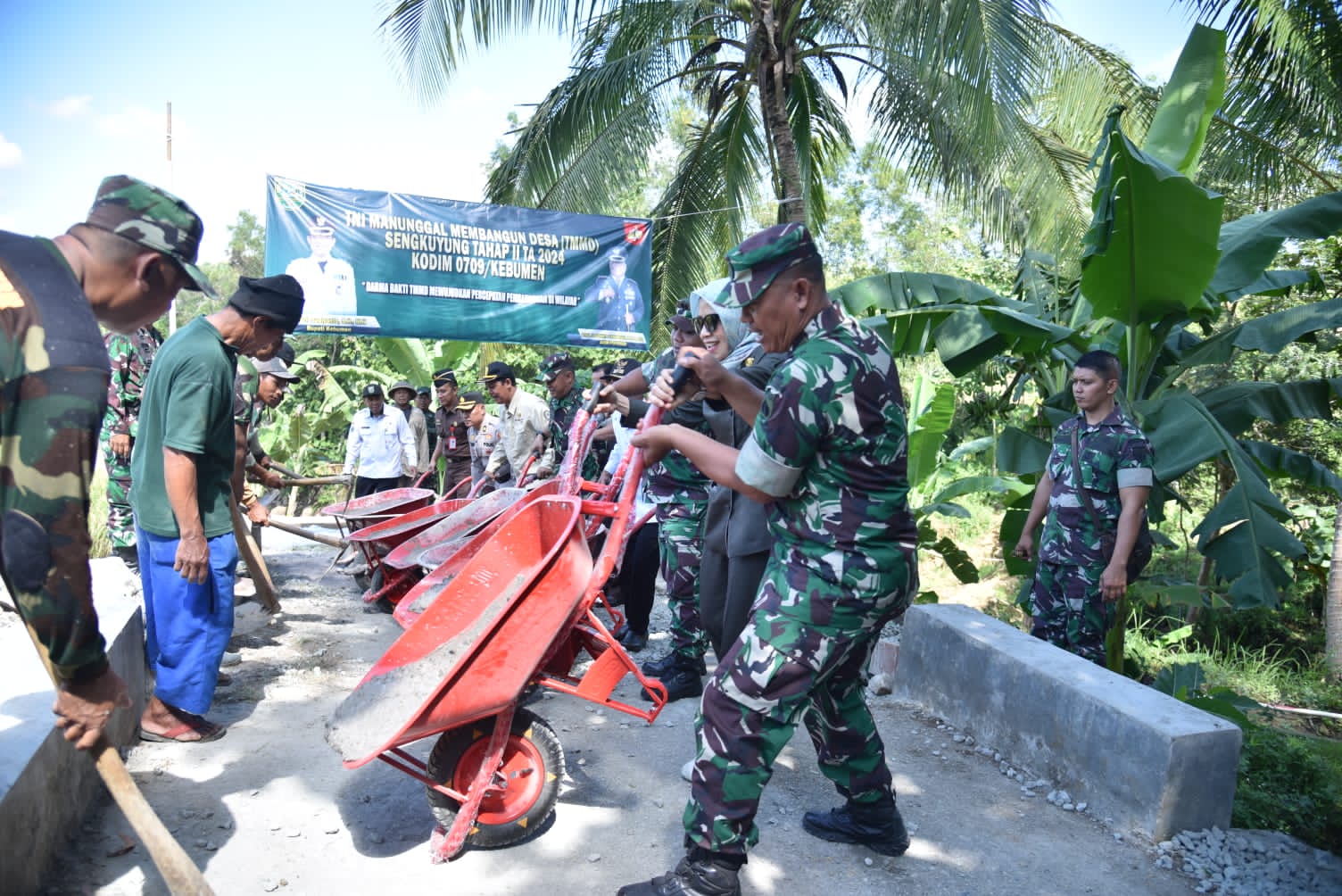 KEBUMEN, Kebumen24.com – Untuk membantu masyarakat dalam Meningkatkan produktifitas pertanian, ratusan personil anggota TNI bergotong royong membangun jalan rabat beton sepanjang 750 meter. Jalur yang sebelumnya rusak berat dan sulit dilalui warga, sehingga distribusi pertanian tersendat.
