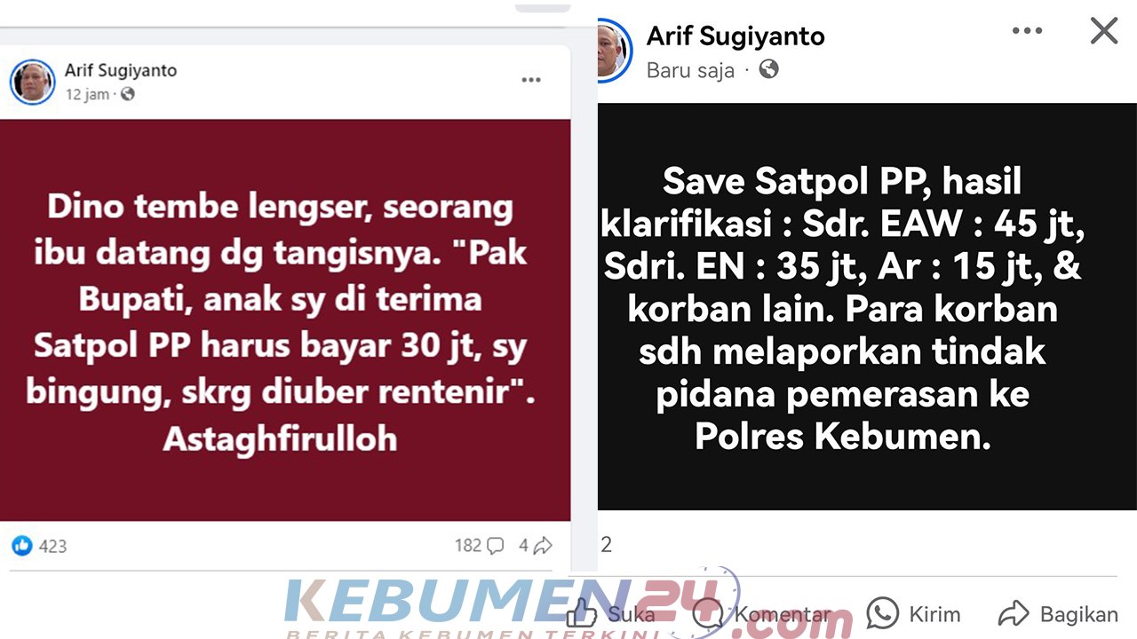 Sebagai pengingat agar kejadian ini tidak berulang, Bupati Kebumen Arif Sugiyanto menulis pada akun Facebook pribadinya pada Rabu sore. “Save Satpol PP, hasil klarifikasi :Sdr. EAW : 45 jt, Sdri EN: 35 jt, Ar :15 jt, & korban lain. Para korban sudah melaporkan tindak pidana pemerasan ke Polres Kebumen.” tulis Bupati pada unggahannya.