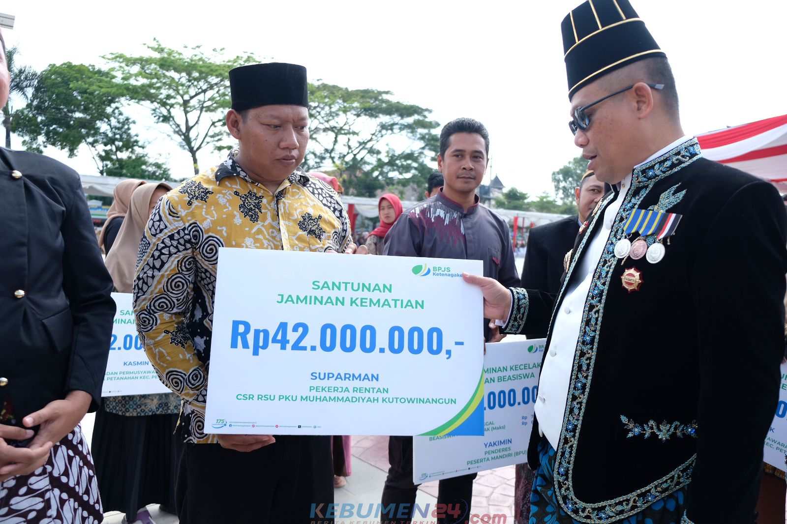 KEBUMEN, Kebumen24.com – Bupati Kebumen Arif Sugiyanto menyerahkan santunan Jaminan Kematian (JKM) kepada enam orang ahli waris yang disalurkan melalui BPJS Ketenagakerjaan. Penyerahan dilakukan pada saat peringatan Hari Jadi Kebumen ke 395 di Alun-alun Pancasila Kebumen.