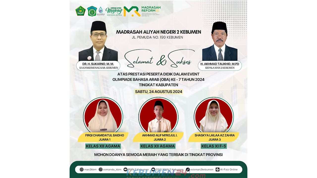 KEBUMEN, Kebumen24.com – Tiga siswa MAN 2 Kebumen berhasil juara dalam Olimpiade Bahasa Arab (OBA) Tingkat Kabupaten 2024. Kompetisi bergengsi ini diselenggarakan oleh Forum Musyawarah Guru Mata Pelajaran (MGMP) Bahasa Arab se-Kabupaten Kebumen, pada Sabtu 24 Agustus 2024 kemarin.