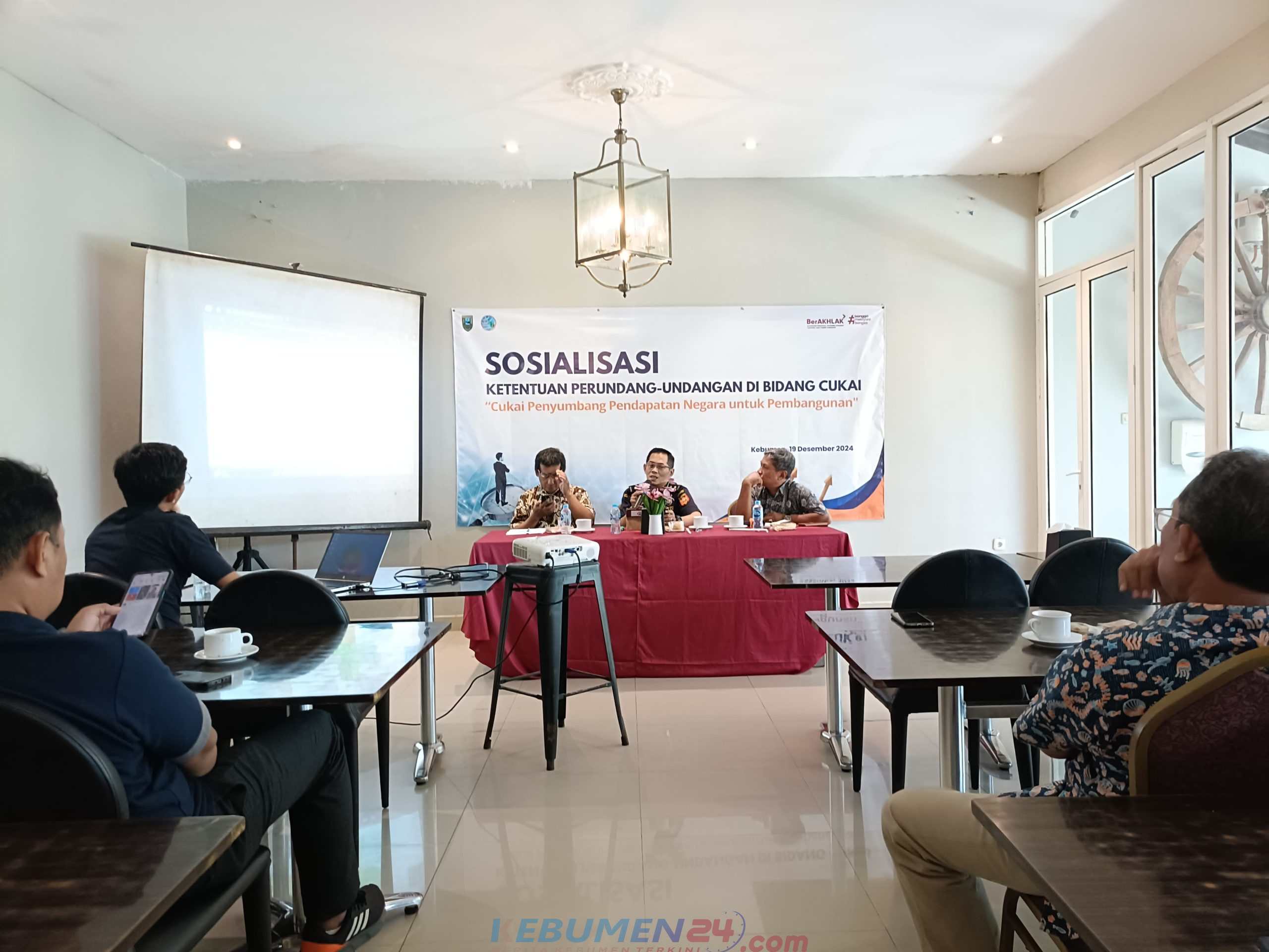 Acara berlangsung Momong Resto, Kebumen, Kamis, 19 Desember 2024. Hadir Kepala Seksi Kepatuhan Internal dan Penyuluhan Kantor Pelayanan dan Pengawasan Bea Cukai Cilacap, Irwan Riyadi, Sekretaris Diskominfo Kebumen Unggul Winarti, Bagian Kesejahteraan SDA Sekda Kebumen Eko Yunianto serta awak media di Kebumen.