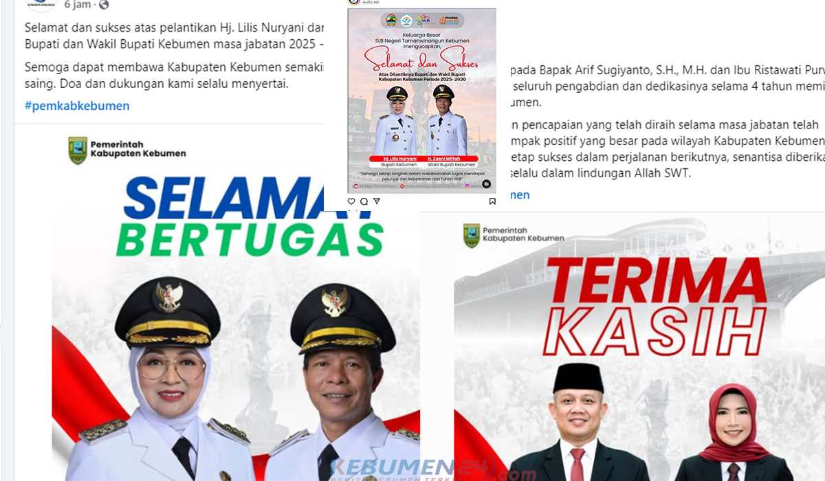 “Selamat kepada Ibu Lilis Nuryani Fuad dan Bapak Zaini Miftah atas amanah baru sebagai Bupati dan Wakil Bupati Kebumen. Semoga sukses dalam menjalankan tugas dan membawa Kebumen semakin maju,” tulis salah satu akun resmi instansi pemerintahan di media sosial.