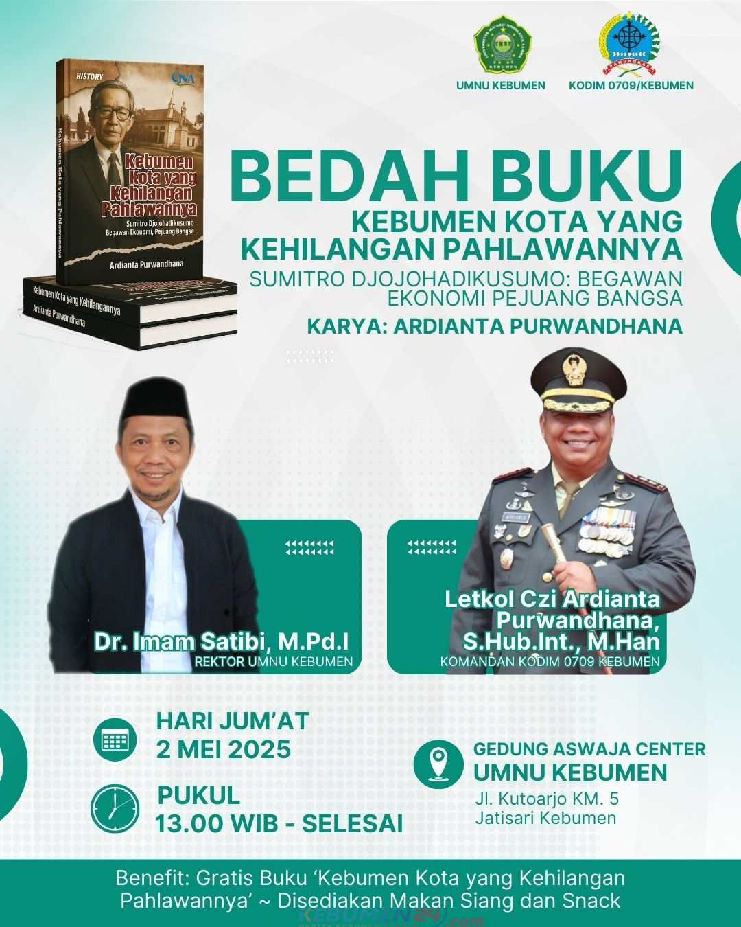 Dua narasumber utama akan hadir dalam bedah buku ini, yakni Rektor UMNU Kebumen Dr. Imam Satibi, M.Pd.I, dan Komandan Kodim 0709/Kebumen Letkol Czi Ardianta Purwandhana, S.Hub.Int., M.Han., yang juga merupakan penulis buku tersebut.