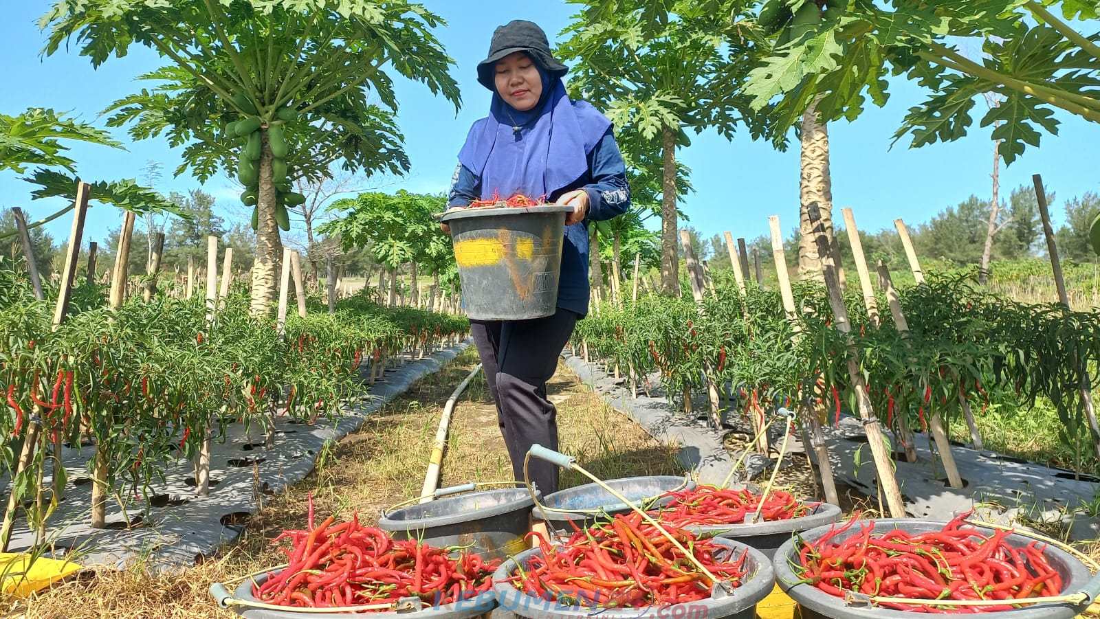 Di tengah panas terik matahari, beberapa petani memetik cabe merah kriting dengan penuh semangat. Salah satunya adalah Indah, petani yang mengaku telah setahun terakhir menekuni budidaya cabe bersama suaminya.