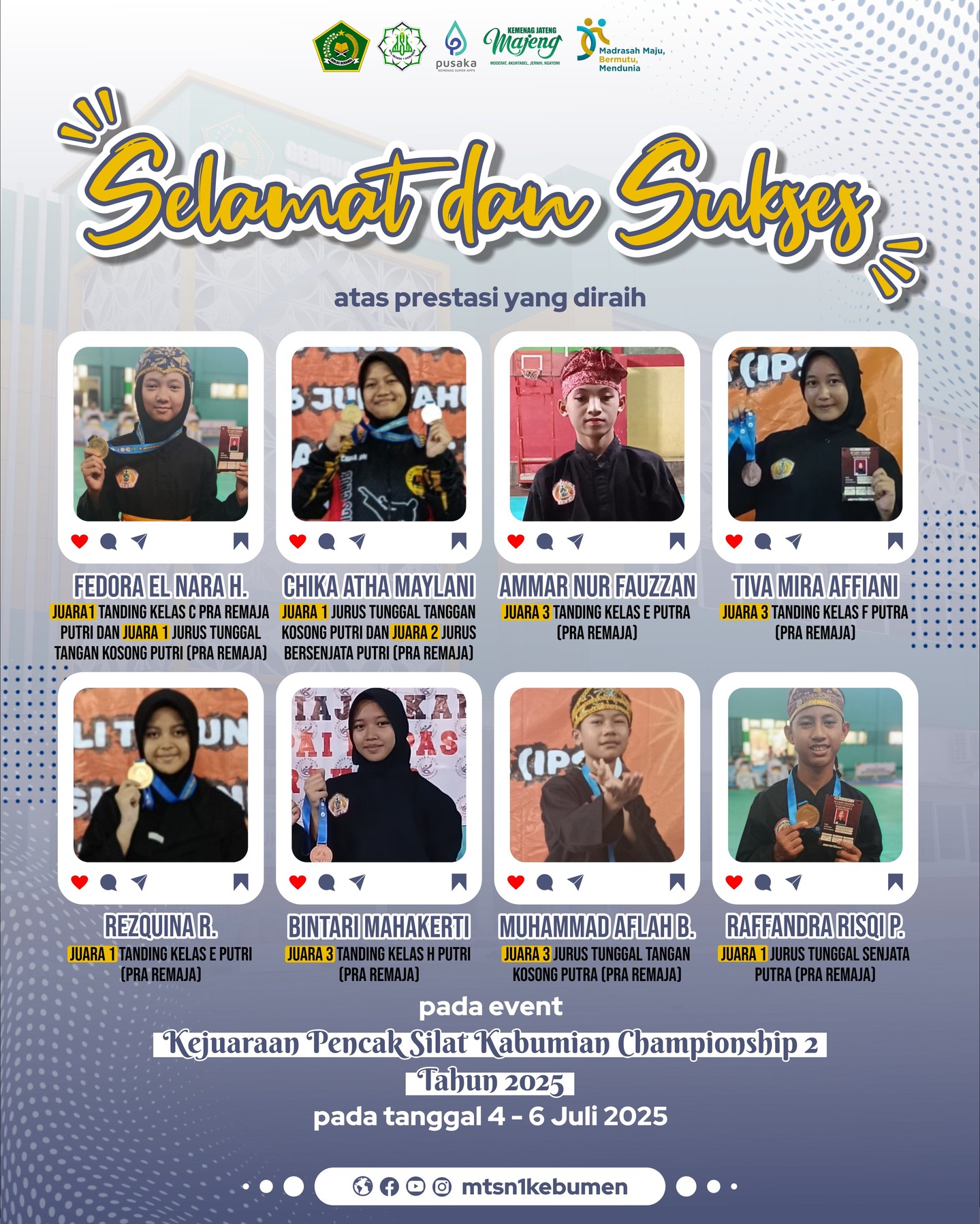KEBUMEN, Kebumen24.com — Prestasi gemilang ditorehkan oleh para atlet muda MTs Negeri 1 Kebumen. Dalam ajang Kejuaraan Pencak Silat Kabumian Championship 2 Tahun 2025 yang berlangsung pada 4–6 Juli 2025, para pesilat MTsN 1 Kebumen berhasil menyabet berbagai gelar juara, mengharumkan nama madrasah di tingkat kabupaten.