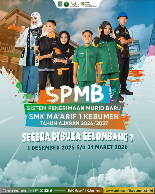 KEBUMEN, Kebumen24.com — Kesempatan emas bagi calon peserta didik baru kembali dibuka. SMK Ma’arif 1 Kebumen resmi memulai pendaftaran Sistem Penerimaan Murid Baru (SPMB) Tahun Ajaran 2026/2027 untuk Gelombang 1, yang berlangsung mulai 1 Desember 2025 hingga 31 Maret 2026.