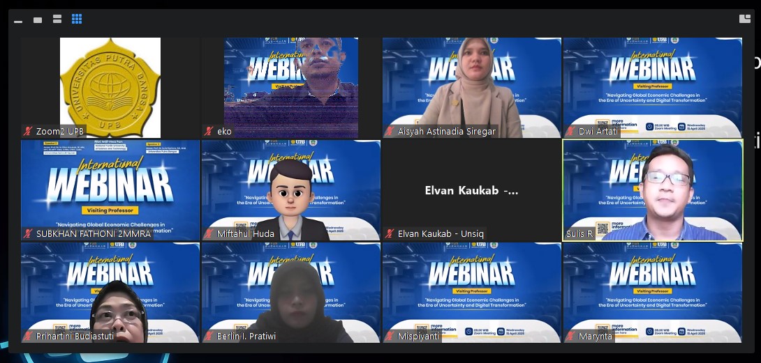 KEBUMEN, Kebumen24.com – Universitas Putra Bangsa kembali menunjukkan komitmennya dalam menghadirkan forum akademik berkelas dunia dengan menyelenggarakan webinar internasional bertajuk “Navigating Global Economic Challenges in the Era of Uncertainty and Digital Transformation”, Rabu (15/4/2026).