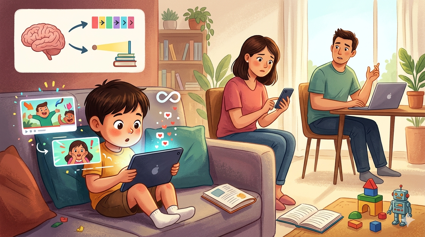 Fenomena konsumsi konten video pendek seperti YouTube Shorts turut menjadi sorotan. Konten singkat yang terus diulang dapat memicu pelepasan dopamin di otak, yang membuat anak merasa senang dan ingin terus mengaksesnya.